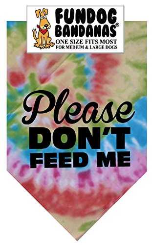 -. Binding : Misc. -. Brand : FunDog Bandanas -. Color : Tie DYe -. EAN : 0083351960001 -. Feature : Cute! / Fun! / Affordable! / Makes a great gift! / 22x22x31inches -. Label : The Dog Perk Corporation -. Manufacturer : The Dog Perk Corporation -. PackageQuantity : 1 -. ProductGroup : Pet Products -. ProductTypeName : PET_SUPPLIES -. Publisher : The Dog Perk Corporation -. Size : One size fits most for medium to large dogs -. Studio : The Dog Perk Corporation -. Title : BANDANA - Please Don't Feed Me for Medium to Large Dogs - tie dye with black ink -. UPC : 083351960001