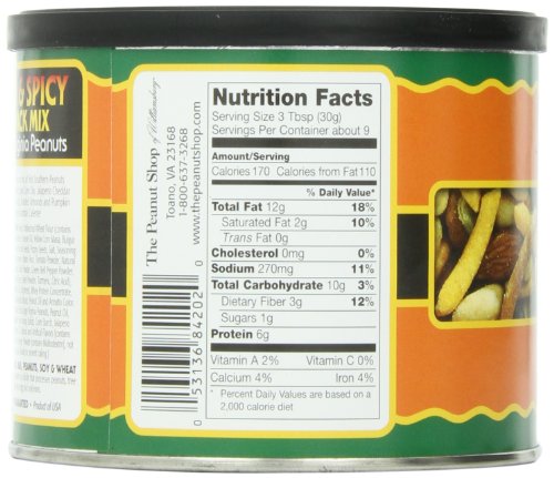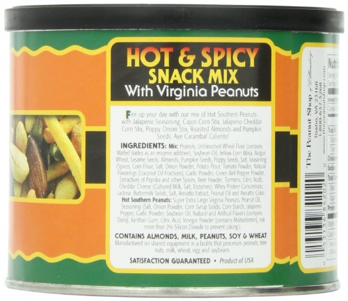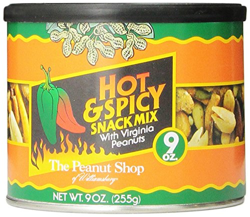 -. Binding : Grocery -. Brand : The Peanut Shop of Williamsburg -. EAN : 0053136842020 -. Feature : Distinctively unique and different And unbelievably crisp / Our same Super Extra Large Handcooked Virginia Peanuts are lightly seasoned in a variety of flavors / Try a tin for yourself and give several as gifts to those you wish to receive the finest -. Label : The Peanut Shop of Williamsburg -. Manufacturer : The Peanut Shop of Williamsburg -. Model : 84202 -. NumberOfItems : 1 -. PackageQuantity : 1 -. ProductGroup : Grocery -. ProductTypeName : GROCERY -. PublicationDate : 2012-04-26 -. Publisher : The Peanut Shop of Williamsburg -. Studio : The Peanut Shop of Williamsburg -. Title : The Peanut Shop of Williamsburg Hot & Spicy Snack Mix, 9-Ounce Tin -. UPC : 053136842020