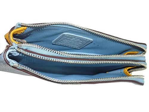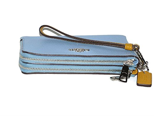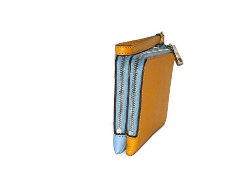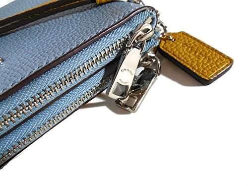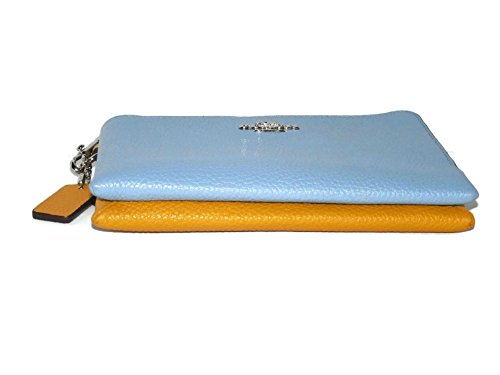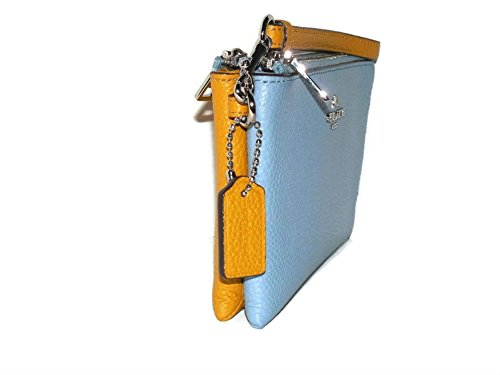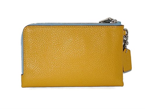 -. Brand : -. Color : Blue / Yellow -. Department : womens -. EAN : 0889532106103 -. Feature : Crafted of 's pebbled leather in the Colorblock design with one compartment a lovely light blue and the other sunflower yellow. / There is a handy sunflower yellow leather wrist strap with a polished nickel swivel type clip that can also be attached to the inside of your handbag. / Lined with 's signature sateen/cotton blend material in a coordinating color. / There are two multifunction pockets and the signature leather creed patch in one compartment. The other compartment is roomy and perfect for your cell phone! / Measurements: 6 ½" (L) x 4" (H) x 1 ¼" (D) -. Model : 64799 -. ProductGroup : Shoes -. ProductTypeName : HANDBAG -. Title : Colorblock Double Corner Zipper Blue Sunflower Yellow Leather Wristlet, 64799 -. UPC : 889532106103