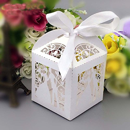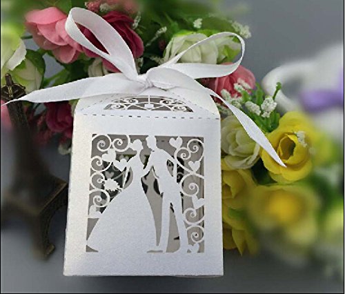 Saitec ® 50 new Laser Cut Bridegroom and bride Wedding Box in Pearl candy paper box wedding party show candy box gifts Box(with ribbon)