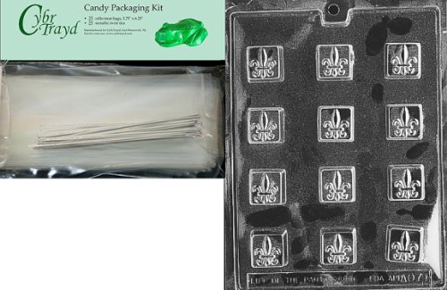 Cybrtrayd Mdk25S-AO079 Fleur-De-Lis All Occasions Chocolate Candy Mold with Packaging Bundle of 25 Cello Bags, 25 Silver Twist Ties and Chocolate Molding Instructions