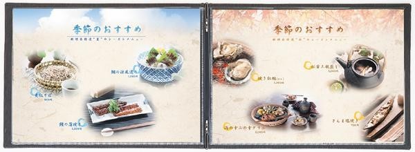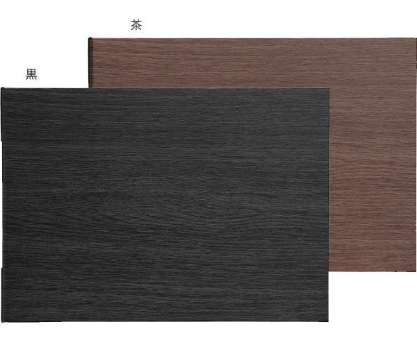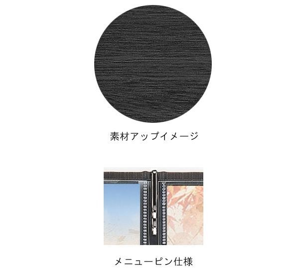 | 背表紙が二重になっていますので、外からピンが見えません。木目柄が美しい人気のメニューブックです。和風・洋風どちらにもしっくりと似合います。 |