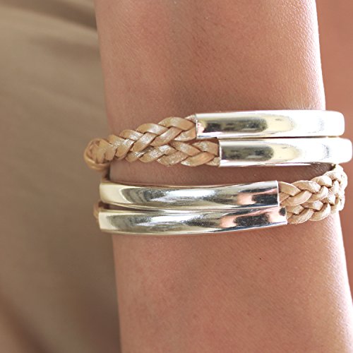 The Mini Addison braided wrap bracelet in silverplate metal crescents features a double braided leather strand with wide crescents. The Metallic Gold leather may have a subtle two-tone designed to enhance the Bohemian look and feel. Designed to be worn as a bracelet only, although some may be able to wear it as a small choker-style necklace. Secured by a lightweight silverplate swivel clasp so your wrist won't feel weighted down. Handmade in the USA.Feature
