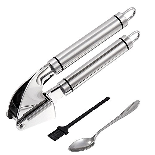 Stainless Steel Kitchen Garlic Press – Professional Heavy Duty Garlic Mincer and Crusher with Cleaning Brush & Spoon Included