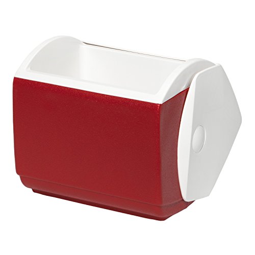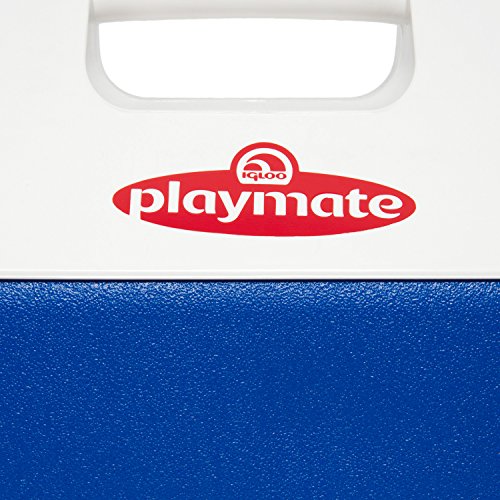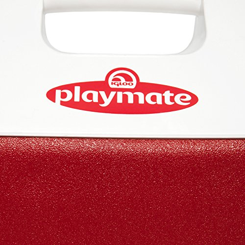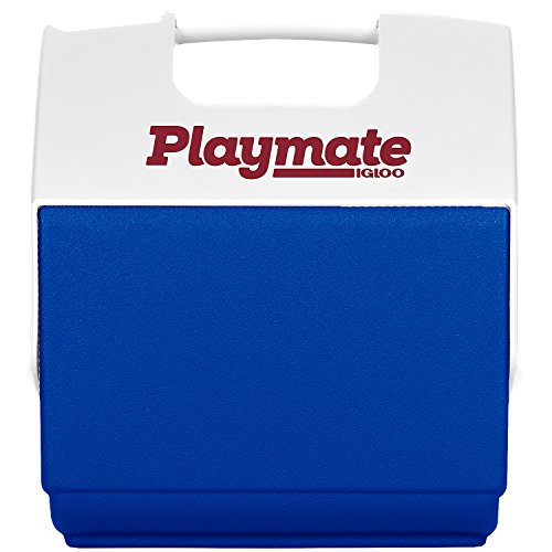 Amazon.com The Igloo Playmate Pal 7-Quart Cooler is a favorite everywhere for outdoors use, lunch, sports, events, and more. The cooler sports a unique tent shaped locking lid that makes it easy to pack in a day's lunch and drinks. Featuring an easy to use, one-handed push-button on top that swings the lid open to either side, the Playmate delivers convenient access to the contents. The cooler holds nine cans plus ice and wipes clean after use. 1-year limited warranty. Specifications: - Overall capacity: 7 quarts/6 liters