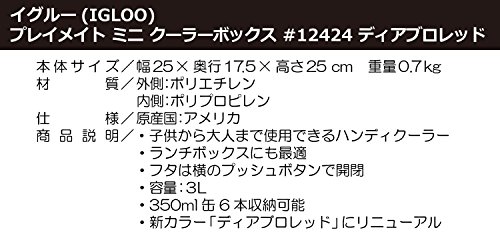 Studio : Igloo ReleaseDate : 2010-09-13 Publisher : Igloo Binding : Sports Product Description A favorite around the world, this unique "tent top" cooler is ideal for average-sized lunch appetites at work or school. Playmate is the perfect choice for a few hours soaking up the sun. Holds 9 cans plus ice. Made in USA. 0