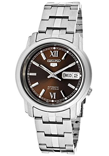 Dress watch, Automatic movement (21 jewels), Polished silver-tone hands with luminous accents, Continuously sweeping polished silver-tone seconds hand, Applied polished silver-tone Roman numerals mark twelve and six o'clock positions, Applied polished silver-tone baton markers, Luminescent dot hour markers and silver-tone indices form surrounding minute track, Dual panel analog day-and-date aperture at three o'clock position, Brushed brown dial with polished silver-tone shield logo applique below twelve o'clock position, Brushed silver-tone stainless steel bracelet with polished detailing, adjustable links and push-button-clasp, Polished silver-tone stainless steel bezel, Brushed/polished silver-tone stainless steel round case, Textured steel crown, Stainless steel screw-down exhibition caseback, Hardlex crystal, 3 ATM (30 meters/100 feet water resistant)Feature