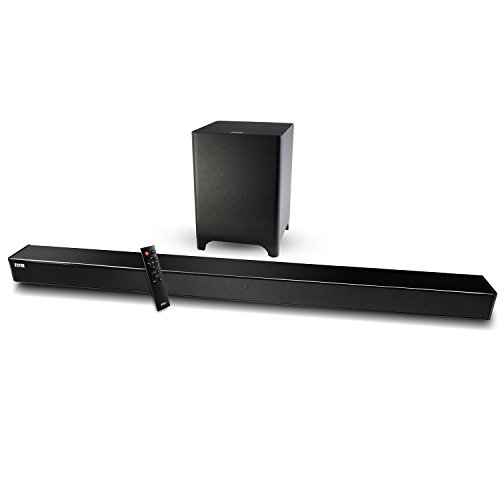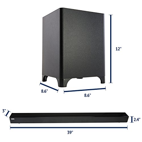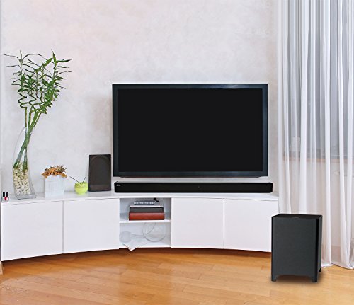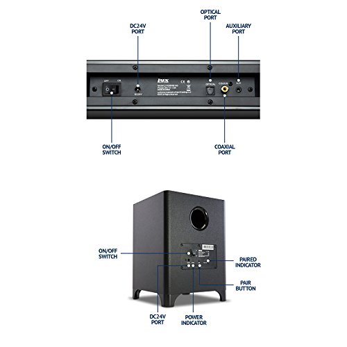 -. Feature : COMPLETE HOME THEATRE SYSTEM - Mini Soundbar & Subwoofer Combo Delivers Loud, Crystal Clear Audio & Booming Bass for Movies, TV, Videogames, Music, Etc. / BLUETOOTH SOUND BAR - Sleek Mountable Speaker Plugs Into Television or Connects to Smart Device Via Bluetooth/3.5mm Cable for Room-Filling Sound / POWERFUL WIRELESS SUBWOOFER - Bluetooth Powered Sub Adds Rich Bass Without Messy Wires; Place Anywhere in Room for Cinema-Quality Performance / CONVENIENT REMOTE CONTROL - All-in-One Set Arrives w/ Handy Remote for Powering On/Off, Pairing Devices, Mute & Adjusting Sub, Treble & Stereo Volume / BEAUTIFUL STREAMLINED DESIGN - Versatile System Can Be Mounted Via Brackets & Accommodates Multiple TV/Wireless Connections; Discreet Modern Silhouette
