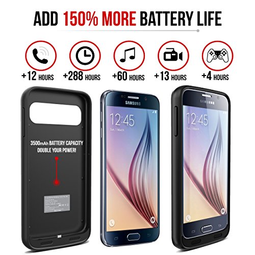 POWERFUL CHARGE: 3500mAh Galaxy S6 battery case effectively charges well over 100% to last you the entire day. Easy access to all ports, sensors, speakers and camera. Extra battery life means 12+ hours talk-time, 288+ hours standby time, 60+ hours audio time, 13+ hours of video and 12+ hours of 3G surfing time for Samsung Galaxy S6.