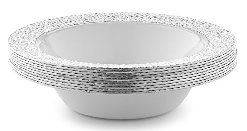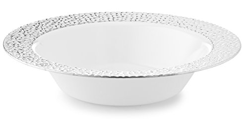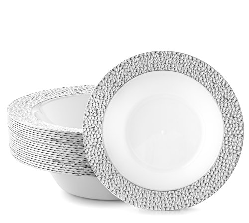 DAZZLE PLASTIC PARTY DISPOSABLE BOWLS | 14 Ounce Hard Round Wedding Soup Bowls | White with Silver Rim, 20 Pack | Elegant & Fancy Heavy Duty Party Supplies Plates for all Holidays & Occasions