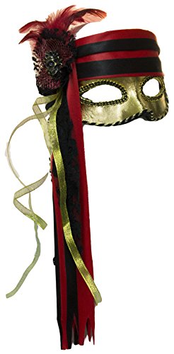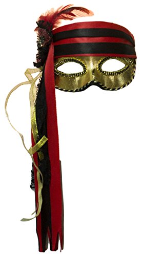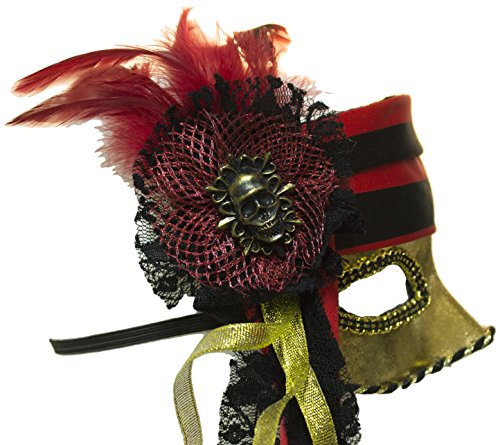 -. Brand : Jacobson Hat Company -. Color : multiple colors -. Department : womens -. Feature : Beautiful venetian pirate mask / Mask features classic tones of black, red and gold / Elastic bamd allows for a comfortable fit / Adorned with an array of beautiful ribbon, feathers and lace / Perfect accessory for your costume -. PackageQuantity : 1 -. ProductGroup : Apparel -. ProductTypeName : ADULT_COSTUME -. Size : One Size -. Title : Lady Pirate Venetian Half Mask with Feathers and Ribbon -. UPC : 708325304710