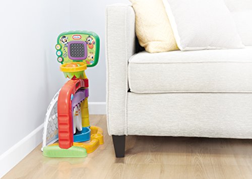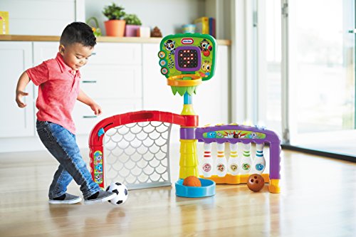 Triple the play with the Little Tikes 3-in-1 Sports Zone! Dunk, kick and score with your child’s 3 favorite sports: basketball, soccer and bowling! Basketball features an adjustable height hoop to grow with your child. The backboard lights up and features over 75 rewarding sounds and phrases that activate when shots are made! Plus, it folds up compactly for easy storage.