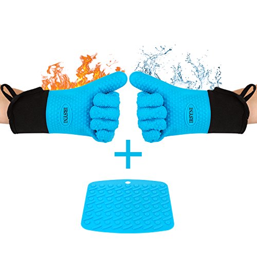 Silicone Cooking Gloves Quilted Cotton Lining, Long Waterproof Non-slip Oven Gloves Heat Resistant, Professional Thick Oven Mitts for Kitchen, Baking, Grilling, BBQ, 1 Pair, Blue, Pot holder as Bonus