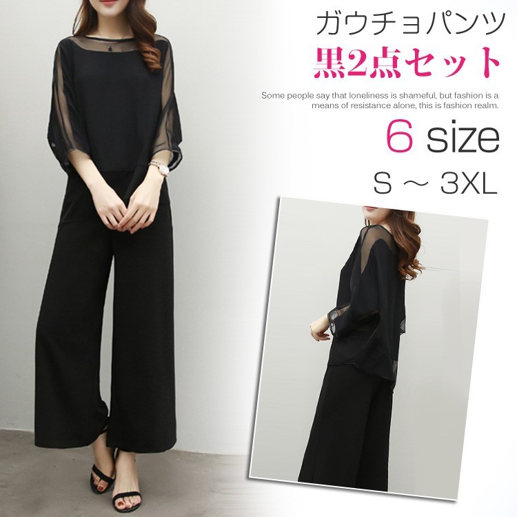 ●商品写真はできる限り実物の色に近づけるよう加工しておりますが、お客様が使用するパソコンのモニター設定や部屋の照明により多少、色の変化が感じられる場合がございます。パンツドレス 2点セット セットアップ ガウチョパンツ フォーマル スーツパンツ ワイドパンツ ガウチョ 美脚パンツ 黒パンツ フォーマル 上下2点セット シフォンブラウス シャツ ブラウス ブルー シフォン シャツブラウス キレイめ 着痩せ 通勤 オフィス レディース 30代 40代 ファション 春 秋 大きいサイズ ★素材:ポリエステル ★セット内容:トップス+パンツ ★生産国:中国★カラー:黒★サイズ(cm):S:バスト98 袖丈38 肩幅42 トップス丈63 ウエスト64-84 パンツ丈84M:バスト100 袖丈39 肩幅43 トップス丈64 ウエスト66-88 パンツ丈84L:バスト102 袖丈39 肩幅43 トップス丈65 ウエスト70-92 パンツ丈84XL:バスト104 袖丈40 肩幅44 トップス丈66 ウエスト74-96 パンツ丈85XXL:バスト108 袖丈41 肩幅45 トップス丈67 ウエスト76-98 パンツ丈86