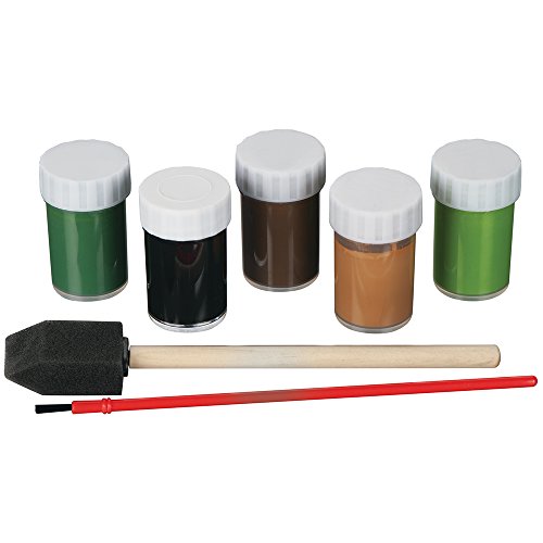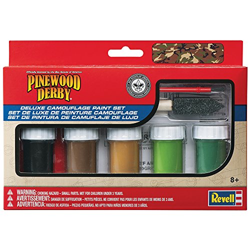 -. Binding : Toy -. Brand : Revell -. EAN : 0031445094255 -. Feature : Officially licensed, race-legal product of the boy scouts of America for pinewood derby races / How to make your standout racer blend in at the track. / This set has everything you need to be the "stealth" competitor at the track. / Includes two easy-to-use brushes and five camo colors. / All five colors are non-toxic, water-based, and easy to clean up with water. -. Label : Hobbico Inc -. Manufacturer : Hobbico Inc -. Model : RMXY9425 -. MPN : RMXY9425 -. NumberOfItems : 7 -. PackageQuantity : 1 -. PartNumber : RMXY9425 -. ProductGroup : Hobby -. ProductTypeName : TOYS_AND_GAMES -. Publisher : Hobbico Inc -. ReleaseDate : 2017-10-20 -. Studio : Hobbico Inc -. Title : Revell Pinewood Derby Camouflage Deluxe Paint & Brush Set -. UPC : 031445094255 -. Warranty : See Mfg. Website
