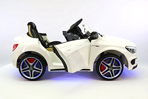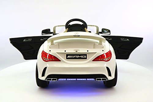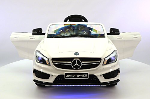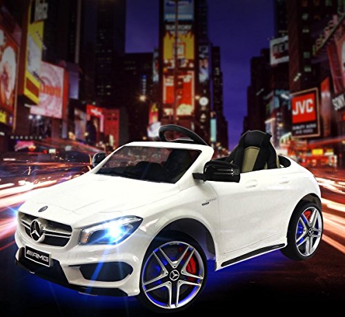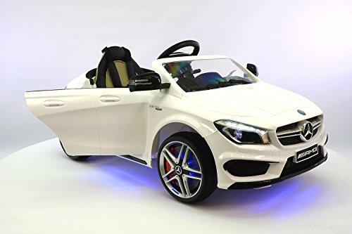 -. Binding : Toy -. Brand : Moderno Kids -. Color : White -. EAN : 0602401639416 -. Feature : •12-Volts of Battery Power allow for two speeds Forward (2 - 4 MPH) + Reverse / •Leather Genuine Seat •Adjustable Seat Belt •Two Openable Doors •Trunk Space / •2 Engine Motors •110V Charger is included •Soft Start / •Aux plug in for Music •Multifunctional effects of sound • High Capacity Front/Rear LED Lights / •Bluetooth Parent Remote Controlled or Operate by Foot Pedal accelerator and Steering Wheel - For 2-5 Years Of Age -. IsAdultProduct : 0 -. Label : Moderno Kids -. Manufacturer : Moderno Kids -. ProductGroup : Toy -. ProductTypeName : TOYS_AND_GAMES -. Publisher : Moderno Kids -. Studio : Moderno Kids -. Title : 2016 Mercedes CLA 45 AMG 12V Power Kids Ride on Toy w/Remote control|Leather Seat|UV Lights -. UPC : 602401639416