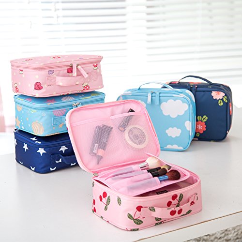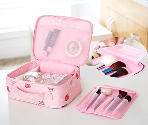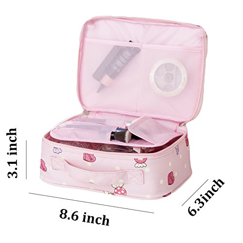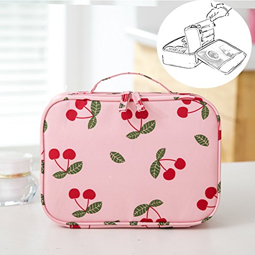 LANGUGU Waterproof 2 Layer Large Capacity Cosmetic Bag Portable Makeup Brush Organizer Kit Multifunctional Vacation Travel Home Toiletry Cute Printed Pouch for Little Young Girl (Cherry)