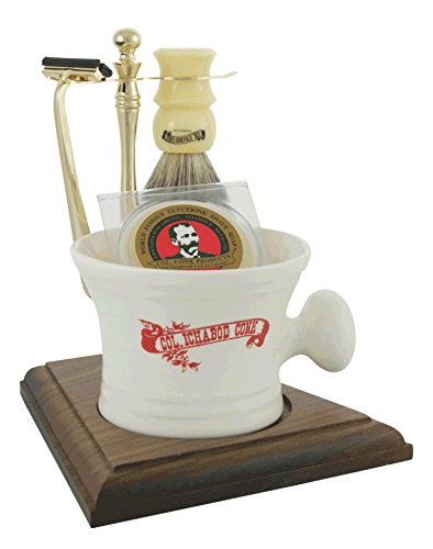 -. Feature : Deluxe boar brush / Gold-tone Double Track razor / Gold-tone stand with fine hardwood base holds brush and razor / 2.25 oz. Colonel Conk's world-famous glycerin shave soap / Old-fashioned ceramic apothecary mug