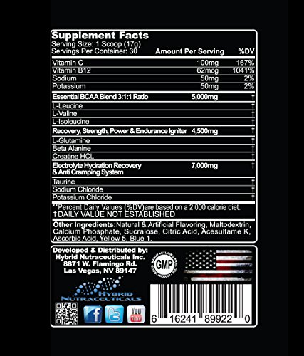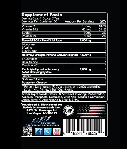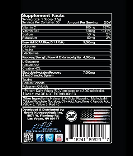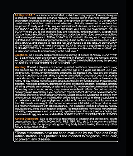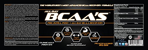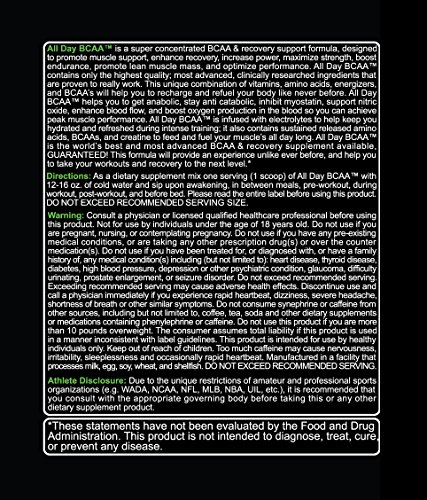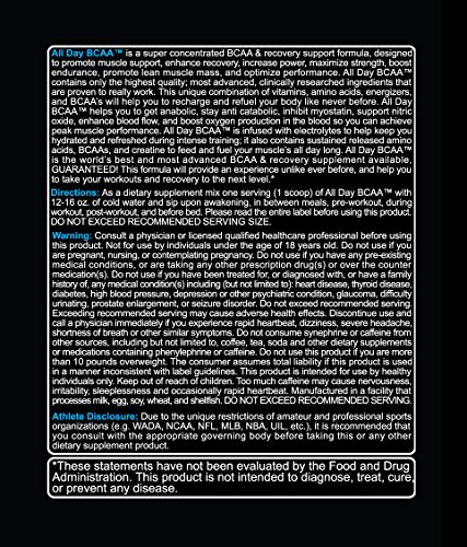 -. Feature : All Day BCAA Post Workout & Recovery Support Supplement! The best post-workout and BCAA supplement on the market. Rated Best Tasting and #1 Post Workout Supplement of the year in 2016 by Multiple Sources. / TASTE AMAZING! 30 Full Servings! Made in the USA in a cGmp Facitilty under the strictest of guidelines! Clinically Dosed! EVERYTHING YOU NEED, NOTHING YOU DON'T! / All Day BCAA Post-Workout Contains Only the Purest Forms of Branch Chain Amino Acids, Glutamine, BCAA's, Beta Alanine, Creatine HCL, Vitamin C, Vitamin B12, L-Leucine, L-Valine, L-Isoleucine, Electrolytes, Taurine, Sodium Chloride, Potassium Chloride / Muscle Support & Recovery, Recharge & Refuel Body, Increased Power & Strength, Boosted Performance, Recovery Enhancement! Drink Pre Workout, Post Workout, and Intra Workout or All Day! / High Quality Branch Chain Amino Acids, No Crash, No jitters, No Negative Side Effects!