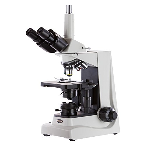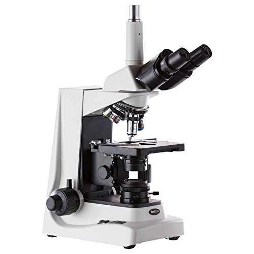 The AmScope T680A compound Siedentopf trinocular microscope has interchangeable pairs of 10x widefield and 16x widefield plan eyepieces, a reverse-mounted quintuple-mount nosepiece with five DIN achromatic objectives, Brightfield halogen illumination, and a double-layer mechanical stage with a stage stop to protect slides and objectives from damage. The trinocular head has a vertical camera mount and a Siedentopf binocular mount with interchangeable pairs of WF10x and WF16x plan eyepieces, 55 to 75mm Siedentopf interpupillary adjustment, a fixed 30-degree vertical inclination to reduce eye and neck strain, and a 360-degree rotation capability to provide a more comprehensive view and enable sharing. Bi-lateral dioptric adjustment accommodates individual eye-strength differences. The vertical trinocular port accepts a camera with a 23mm or C-Mount adapter (camera sold separately). The mechanical tube length is 6-5/16" (160mm). The reverse-mounted revolving nosepiece has 4x, 10x, 20x, 40xS, and 100xS (oil) DIN achromatic objectives that provide color correction of magnified images. The 40xS objective is spring loaded to prevent slide damage when focusing. The 100xS spring-loaded oil-immersion objective uses oil between the specimen and the objective lens to provide increased resolution over a standard objective. A compound microscope is used for inspection and dissection of specimens when two-dimensional images are desired. The microscope has Brightfield illumination. Brightfield (BF) illumination allows the specimen to absorb light, resulting in a dark image on a light background. Halogen illumination provides bright light in a concentrated path, and a Kohler condenser focuses and centers the light path using two iris diaphragms, providing optimum contrast and resolution. The graduated double-layer mechanical stage, with 1mm stage divisions, locks the slide into place and provides precise slide manipulation along the X- and Y-axis to allow coordinates to be recorded, enabling the viewer to return to a specific location on the slide. A stage stop prevents the stage or specimen from coming into contact with the objectives. Graduated coaxial coarse and fine focus has a focusing range of 1-3/16" (30mm) and fine-focus divisions of 0.002mm (0.0000787") that enable measurements to be taken. Focus knob tension control prevents the stage from drifting out of focus. The cast-alloy enamel-coated body is durable and resistant to stains and corrosion. | Specifications |