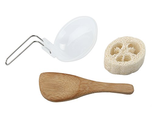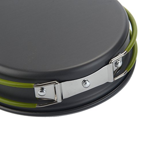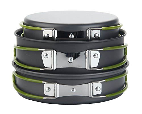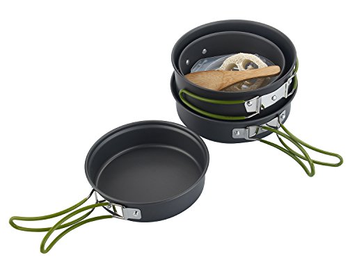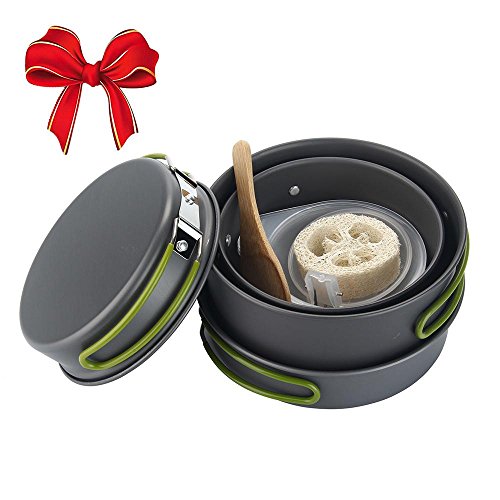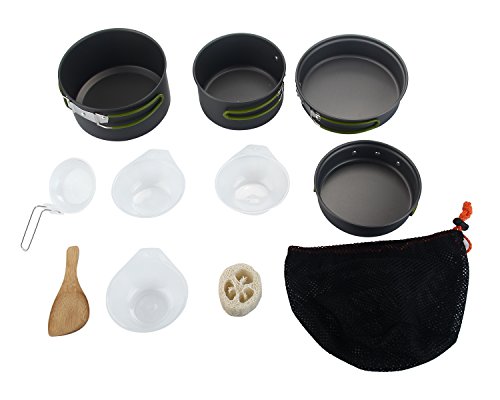 Complete Camping Cookware Set : It includes 2 pot , 2 frying pan, 3 bowls , a rice spoon , a soup spoon and a cleaning loofah. ( Loofah its a light sponge, compact that won't scratch your pots making them last longer. makes it even easier to clean this cookware kit and it's even easier to clean the loofah after you are done using it, just rinse it a little with a water bottle and its ready to go.)