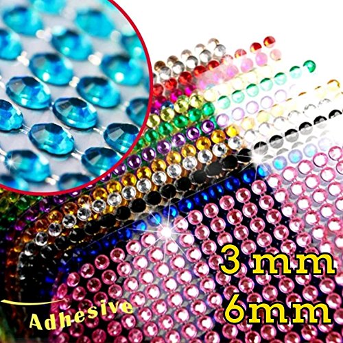 - 3mm (.12"), 750 round adhesive rhinestones per sheet, sheet size 5.5" x 3.25", EACH ORDER IS 4 SHEETS OF THE SAME COLOR AND SIZE.
