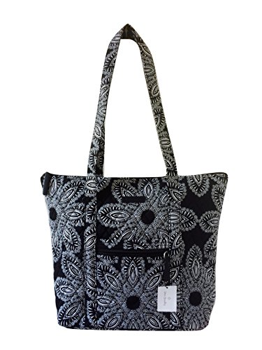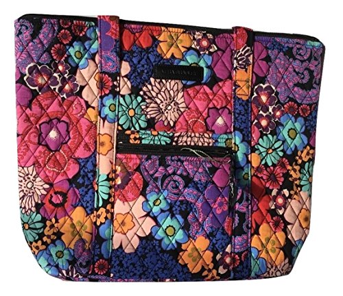 Vera Bradley's durable and spacious Villager Tote is made of soft quilted fabric with a removable sturdy fabric covered bottom insert. The fully zippered top closure reveals a lined interior featuring 6 open slip pockets. This series has been updated with coordinating solid quilted solid interiors. The front offers a small zippered pocket and the dual straps have a very comfortable drop of about 10.5 inches. The Villager is versatile and makes for a great, every day tote - whether for school, work, the beach, or the gym. It makes a great carry-on bag for travel, or even a compact beach bag! It is lightweight, and easily maintained. Just remove the sturdy fabric covered insert and it can be placed in the wash. It measures 13 inches long x 13 inches high x 4 inches wide. The Villager is smaller than the Vera Tote, and slightly larger than the Tote. Machine wash cold, gentle cycle, only non-chlorine bleach as needed, line dry. Patterns with solid color interiors are designed and produced for Vera Bradley Outlet stores.Feature