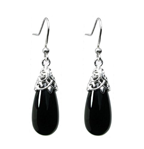 -. Title : Queenberry Sterling Silver Black Natural Onyx Teardrop Dangle Filigree Flower French Hook Earrings