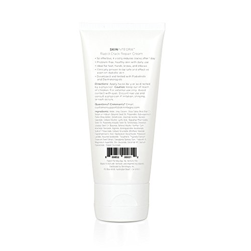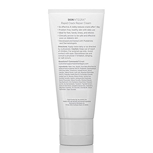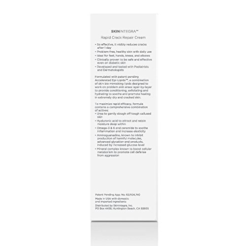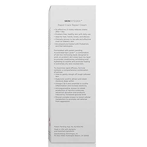 Studio : SkinIntegra Publisher : SkinIntegra Binding : Health and Beauty Product Description NEW SkinIntegraTM Rapid Crack Repair Cream works better than any regular body lotion or body cream ever could to rapidly help heal dry, cracked skin on your feet, heels, toes, hands, fingers, palms, knuckles, knees or elbows. So advanced, it's clinically proven to help heal cracked skin for visible results after just 1 day. Contains: - Accelerated Epi-LipidsTM, an exclusive complex of natural bio-mimicking oils that replicate those found in each layer of healthy skin. Rich in Omega-3 and Omega-6 essential fatty acids, they replenish the vital nutrients skin needs to heal faster. - Magnesium, Zinc and Copper minerals help repair damaged skin. - Oil soluble Vitamin C and Vitamin E, powerful antioxidants, plus Aminoguanidine, a powerful AGE (Advanced Glycation End Product) inhibitor, help combat oxidative stress. - A high dose of Urea plus Lactic Acid exfoliate without abrasion to slough away dry, callused skin enabling the newer, healthier skin beneath to surface faster. - Soothing Fenugreek and Licorice botanicals help calm and condition skin to feel better with every use. Ingredients: Water, Urea, Glycerin, Oryza Sativa (Rice) Bran Oil, Sesamum Indicum (Sesame) Seed Oil, Propanediol, Butyrospermum Parkill (Shea Butter), Dimethicone, Arachidyl Alcohol, Glyceryl Caprylate, Cetearyl Alcohol, Lactic Acid, Hippophae Rhamnoides Seed Oil, Plukenetia Volubilis Seed Oil, Simmondsia Chinensis (Jojoba) Seed Oil, Beeswax, Behenyl Alcohol, Xanthan Gum, Arachidyl Glucoside, Arginine, Aminoguanidine Bicarbonate, Sodium Polyacrylate, Cetearyl Glucoside, Ethylhexyl Stearate, Caprylhydroxamic Acid, Dipotassium Glycyrrhizate (Licorice), Potassium Lactate, Ascorbyl Isostearate, Tocopherol, Trigonella Foenum-Graecum (Fenugreek) Seed Extract, Caesalpinia Spinosa Gum, Trideceth-6, Magnesium Aspartate, Zinc Gluconate, Ceramide NP, Sodium Hyaluronate, Copper Gluconate. 0