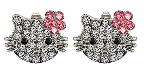 Fashion Hello Kitty silver plated studs packed in a lovely velvet pouch. This is made from a jewelry alloy that makes it look like real silver. Nicely hand polished and hand finished, looks really pretty. Packed in a lovely velvet pouch. These earrings have swarovski crystal stonesFeature