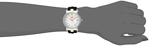 White Dial w/White Mother-Of-Pearl Border, Gold Tone Hands and White and Gold Tone Hour Markers, Gold Tone Arabic Numeral at 12:00; Stainless Steel Case with Ion-Plated Accents; Black Silicone Strap