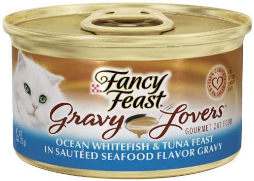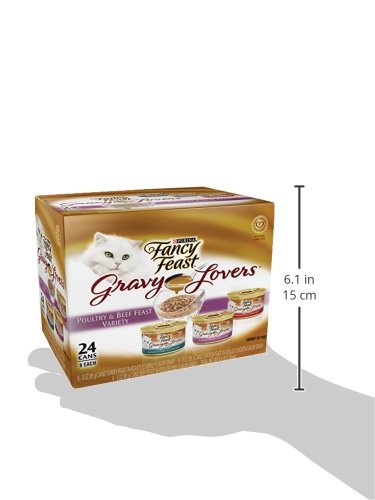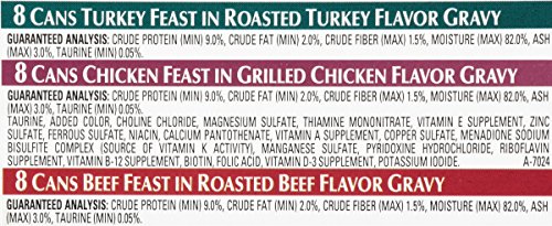 Purina Fancy Feast Gravy Lovers Poultry & Beef Feast Variety Pack contains 8 cans each of: Beef Feast in Roasted Beef Flavor Gravy, Chicken Feast in Grilled Chicken Flavor Gravy, and Turkey Feast in Roasted Turkey Flavor Gravy. Cats absolutely love the taste of the delicious recipes cooked to perfection and swimming in gravy. It offers pet parents the opportunity to give their cat a complete and balanced nutrition meal enriched with vitamins and minerals.Feature