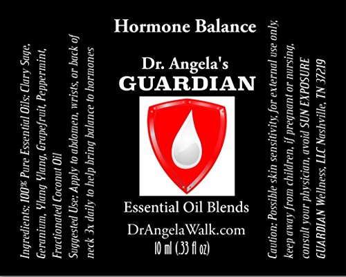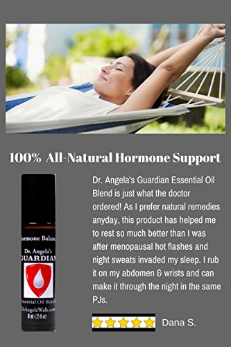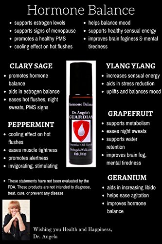-. Feature : Supports Menopause symp, Hot Flashes, Night Sweats. Soothes PMS and painful menstruation. Helps balance hormones and improve mood, supports a healthy sex drive, provides cooling, contentment, and peace / Ingredients: Pure Essential Oils: Clary Sage, Geranium, Ylang Ylang, Grapefruit, and Peppermint blended in a base of all-natural fractionated coconut oil. / 100% Pure Therapeutic Grade Essential Oils, wild crafted and organically grown, GC/MS tested and verified rigorously to ensure purity / Each of our premium aromatherapy blends are packaged in an amber, glass 10 ml roll-on bottle for easy application / Have Questions? Message Dr. Angela through Amazon messages. At Dr. Angela's Guardian Essentials, we also offer other premium blends. Adrenal Reset, All-Natural Flea & Tick Repellent for Dogs, Anti-Aging, Breathe Easy, Digest- Aid, Head & Neck Tension, Hormone Balance, Immune Boosting, K9 Stress-Less, Muscle & Joint, Seasonal Support, Skin Renew, Sleep Assist, Stress Less, Thyroid Solution, Weight Control, Uplifting, and Gift Sets for Men and Women