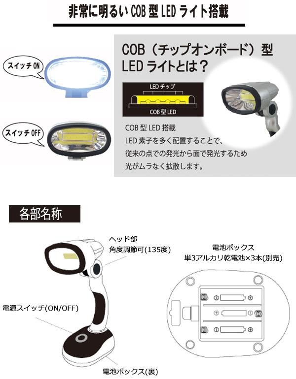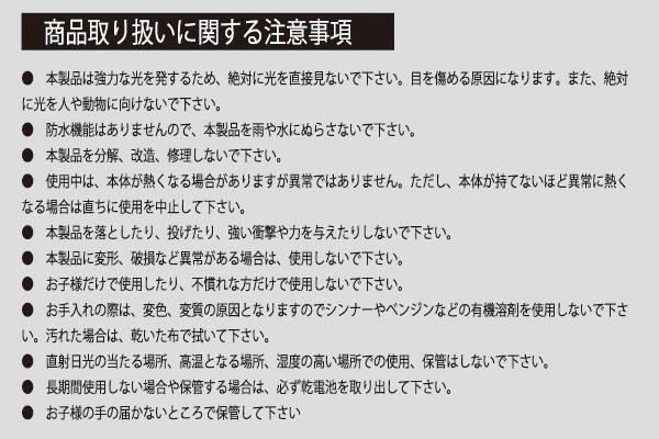 | 仕様 | COB型LED搭載 照射角度7段階(135度)調節 使用電池:単3アルカリ乾電池×3本(別売) 明るさ:230ルーメン 点灯時間:約4時間 保証期間:購入より3ヶ月間(※購入日がわかるものが必要) |