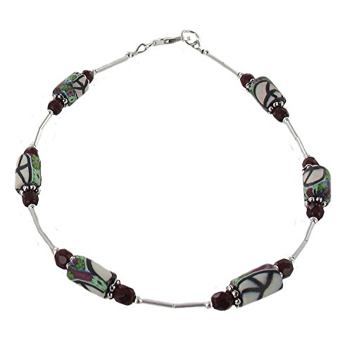 -. Title : Womens Peace Sign Fimo, Red Czech Fire Polished Glass & Sterling Silver Ladies Beaded Anklet with Daisies