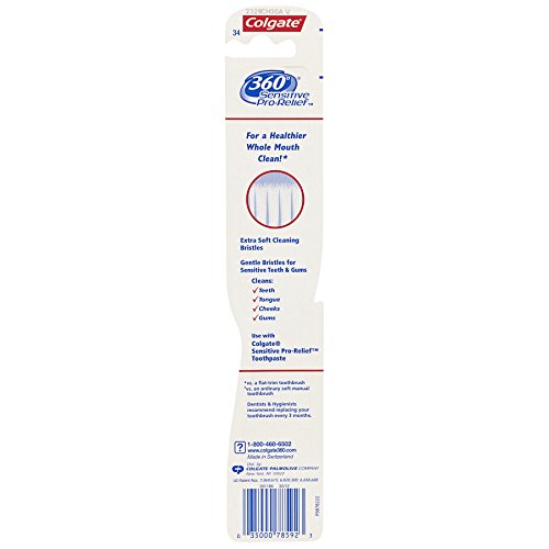 ReleaseDate : 2015-07-16 Studio : Colgate-Palmolive Co Publisher : Colgate-Palmolive Co Binding : Health and Beauty Product Description Colgate 360 Sensitive Pro-Relief Compact head Toothbrush, Extra Soft. Gentle bristles for sensitive teeth and gums. Cheek and tongue cleaner for a healthier whole mouth clean. Use with Colgate Sensitive Pro-Relief toothpaste. 0