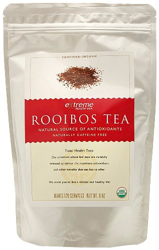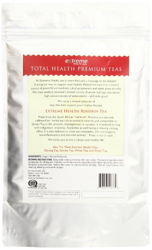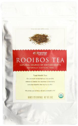-. Binding : Grocery -. Brand : Extreme Health USA -. EAN : 0658623106779 -. Feature : Premium loose leaf tea / Experts quote loose leaf tea is superior to tea bags / USDA Certified, organically grown and selected for its very high concentrations of antioxidants / Loose leaf 4 oz. yields 60 or more servings; the 8 oz. yields 120 or more servings, excellent value -. Label : Extreme Health USA -. Manufacturer : Extreme Health USA -. NumberOfItems : 1 -. PackageQuantity : 1 -. ProductGroup : Grocery -. ProductTypeName : GROCERY -. PublicationDate : 2010-07-16 -. Publisher : Extreme Health USA -. Size : 8 Ounces -. Studio : Extreme Health USA -. Title : Extreme Health USA Extreme Health's Organic Rooibos Tea, Total Health Loose Leaf Tea, 8-Ounce Pouches -. UPC : 658623106779