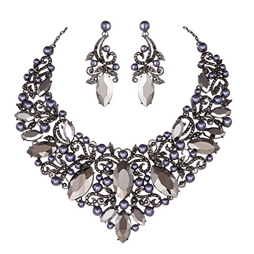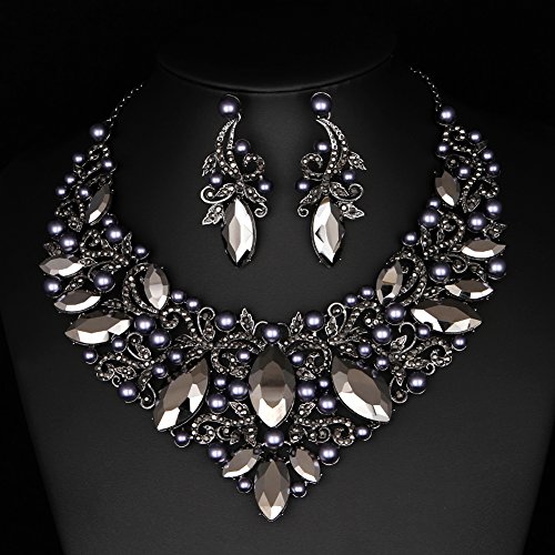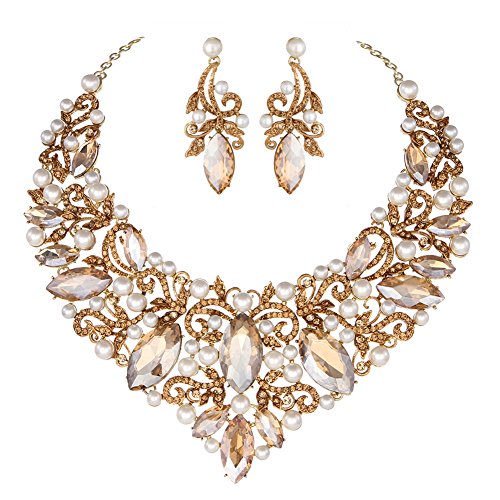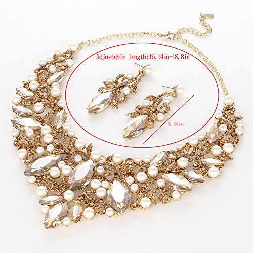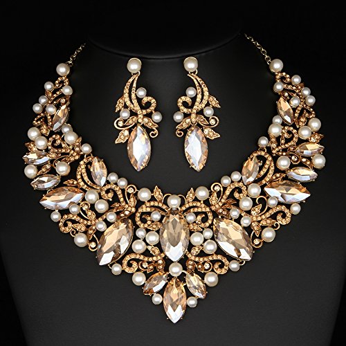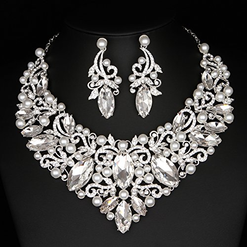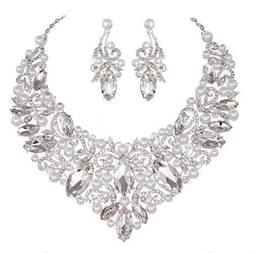 -. Title : Youfir Rhinestone Flower Ribbon Simulated Pearl Bridal Necklace and Earrings Jewelry Sets for Wedding Gown