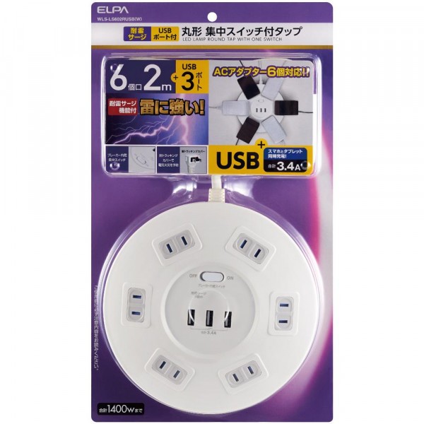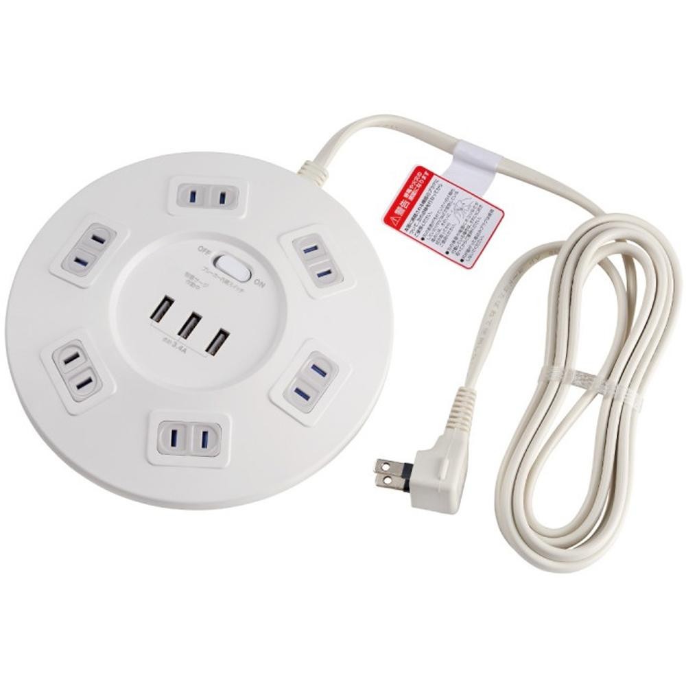 | 仕様 | ■AC差込口定格:AC100V 14A ■合計:1400Wまで ■使用温度範囲:-10度~40度 ■屋内専用 ■口数:6個口 USBポート ■定格:DC5V 最大3.4A(3ポート合計) ■コネクタ形状:USB Aタイプ(メス) ■ポート数:3個口 |