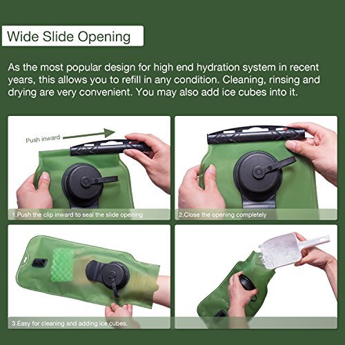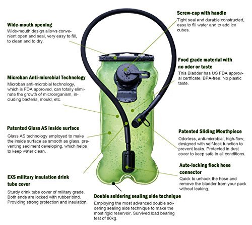 -. Feature : Manufactured of anti-bacteria material. Patented GlassAS technology makes it a high smooth interior surface. The smoothness of the liner prevents the germ and the lime from adhension, which promotes health. / Dual Opening Design: Screw cap + sliding opening. As the most popular design for high end hydration systems in recent years, this allows you to refill in any condition. Cleaning, rinsing and drying are very convenient. You may also add ice cubes into it. / Might be the most rigid hydration bladder on the market: 0.6mm extra thick liner is pressure-tolerant and wearproof; double soldering sealing side technique has greatly improved durablity. / Patented mouth piece and hose connector: Anti-microbial mouth piece, high flow, auto-lock function to prevent leaking, comes with dust cover. Selflock connector allows you to unhook the tube quickly without any leaking. / Capacity: 100 oz / 3 litre; The whole system is made of food grade material and is SGS and FDA certificated.