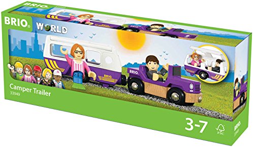 Versatile playset featuring camper and trailer, compatible with the Village theme. The camper is connected to the car with magnets and has a roof lid so you can put in the characters. Ready for take-off. Village is a NEW theme within the BRIO World concept – filled with play values and experience. The Village encourages social roleplay and invites children to play together by telling stories from their everyday life. The Village theme consists of several modular toys like a house, school, singing stage and ice cream stand. This theme offers suggestions but encourages children to create their own settings. A variety of different characters help to get the roleplaying started. All pieces of the Village theme are modular-scaled to fit the rest of the BRIO World and can easily be connected and expanded with the other themes in the BRIO World. BRIO creates innovative, high-quality and well-designed toys with clean, simple designs that spark children's creativity and imagination while encouraging and supporting each stage of their development. For over a century, our mission has been to create happy childhood memories. All wooden parts are made from 100% FSC-certified beech wood from sustainably managed forests and are built to last for generations.Feature