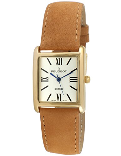Make a statement with this tank shape case design from Peugeot- The classic eclectic Roman numeral dial markers are found on the most famous luxurious Swiss vintage brands. The vibrant brown suede embossed genuine leather band compliments any outfit. Whether you are in your weekend jeans or your business dress attire, you will look your best and projects the sign of success. The metallic blue hands gives it the added final touch.Feature