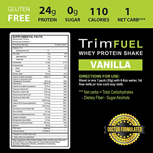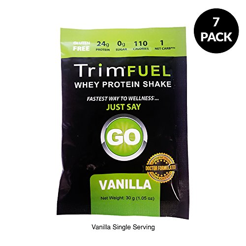 -. Feature : 7 Individual Packages of Vanilla -Great tasting whey protein isolate is gluten free, low fat, low calorie, and low carb / Fortified with minerals, vitamins, amino acids, and antioxidants, Gluten Free, Sugar Free / Trim Fuel Protein has more protein and less carbs, fat and calories than other leading brands / Great for weight loss or general nutrition Blend or mix with 6-8 ounces of water, fat free milk, soy milk or almond milk / MADE IN THE USA