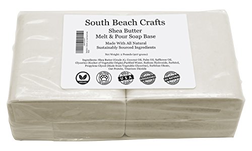 Ingredients: Shea Butter (Grade A), Coconut Oil, Palm Oil, Safflower Oil, Glycerine (Kosher, of Vegetable Origin), Purified Water, Sodium Hydroxide (Saponifying Agent), Sorbitol, Propylene Glycol (Made from Vegetable Glycerine), Sorbitan Oleate (Emulsifier), Oat Protein, Titanium Dioxide.About Our Soap Bases