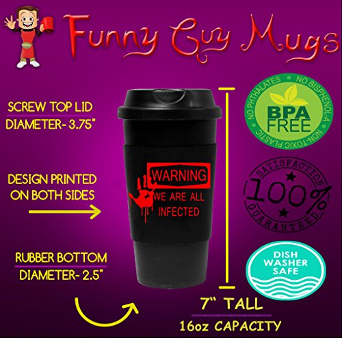 CONTENTS: * 1 BPA Free Plastic Travel Tumbler. 1 Silicone Sleeve * Contents Come New In A Color Gift Box. MATERIAL: * Rubber Bottom * Plastic Screw Top Lid * Double Wall Plastic Body * Double Wall Plastic Body * Silicone Removable Sleeve. Features: * Silicone Sleeve= Reusable, Removable, Eco-Friendly, Dishwasher Safe & Printed On Both Sides * Plastic Tumbler= Double Wall Body, BPA Free Plastic, Rubber Bottom, Screw Top Lid & Machine Washable. SIZING: * Sleeve= Approx 3.5" Tall- 3.5" Diameter * Tumbler= Approx 7" Tall- 2.5" Diameter Base- 3.5" Top Fits In Most Cup Holders. Perfect For The Car, SUV, Van Or Truck. Comfortable Grip That Provides Convenient One-Handed Drinking For Both Left and Right Handed Users. Ideal For Coffee, Tea And Hot Cocoa. Perfect For In The Office Or On The Go. ABOUT FUNNY GUY MUGS: This Tumbler & Sleeve Were Created Exclusively By Funny Guy Mugs. Funny Guy Mugs Is A Trusted Company Ran & Founded By Brothers Whose Mission Is To Create High Quality Products That Put A Smile On Your Face!Feature