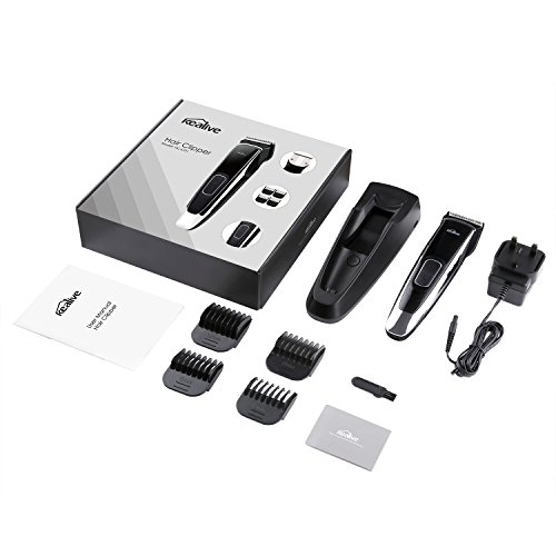 Package Content: 1 x Kealive HC-C01 Cordless Hair Clippers; 1 x American standard AC Power Adapter; 1 x Charging Base; 1 x Cleaning Brush; 4 x Comb Attachments; 1 x User Manual; 1 x 24-Month Warranty Card