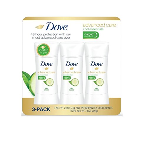 -. Binding : Misc. -. Brand : Dove -. EAN : 0785923307466 -. Feature : Nutrium moisture / 48 hour protection / Cool essentials / With the watery freshness of cucumber and green tea accented by pleasing green and fruity scents, this anti-perspirant deodorant delivers 48-hour odor and wetness protection plus NutriumMoisture for the ultimate care after every shave. / 2.6 oz., 3 pk. -. IsAdultProduct : 0 -. Label : Dove -. Manufacturer : Dove -. MPN : 382933 -. PackageQuantity : 1 -. PartNumber : 382933 -. ProductGroup : Health and Beauty -. ProductTypeName : BEAUTY -. Publisher : Dove -. Studio : Dove -. Title : Dove Advanced Care Deodorants, Cool Essentials (2.6 oz., 3 pk.) -. UPC : 785923307466
