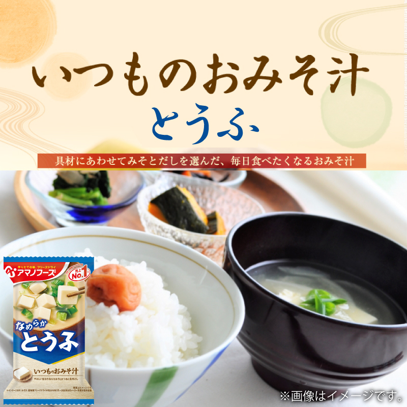 やさしい甘さの合わせみそとかつおとこんぶだしを使用。やさしい味わいのみそとだしが、とうふの素朴な味わいを引き立てます。「いつものおみそ汁」は、具材にあわせて最も相性の良いみそとだしを選んだ、具材のおいしさが引き立つこだわりのおみそ汁です。毎日でも食べ飽きないバラエティー豊かなおいしさをお楽しみ頂けます。中身をお椀に入れ、熱湯をお椀8分目(約160ml)まで注いで軽くかき混ぜてください。