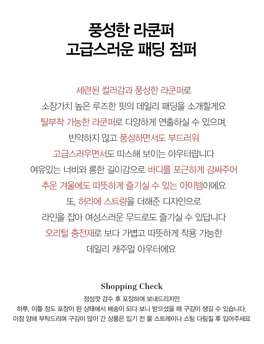 폴리에스터(polyester/)100%충전재(Filler/)오리솜털(duckdownyhair/)80%+깃털(feather/)20%라쿤퍼(raccoonfur/)