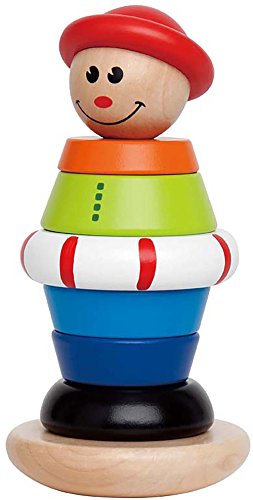 - Stacking rings and wood hat all slide onto the natural wood swivel base